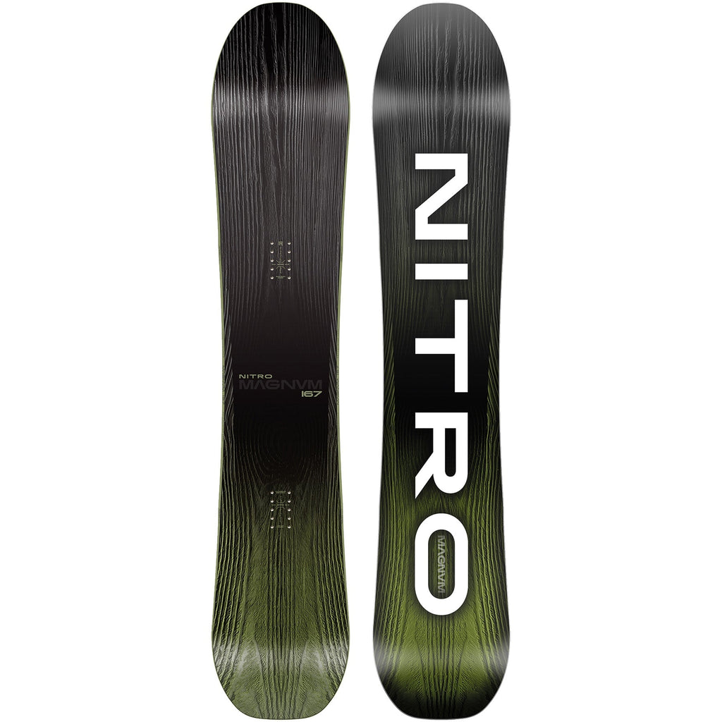 The Nitro Magnum is the ideal all mountain board for big guys. Big feet won't hold you back on this board, the wide waist widths and large sizes are sure to accomodate those big boots and reduce toe and heel drag, giving you speed, control, and total power through your turns. The directional shape also rides powder with ease, so you're covered for any freeride situation you can find yourself in.